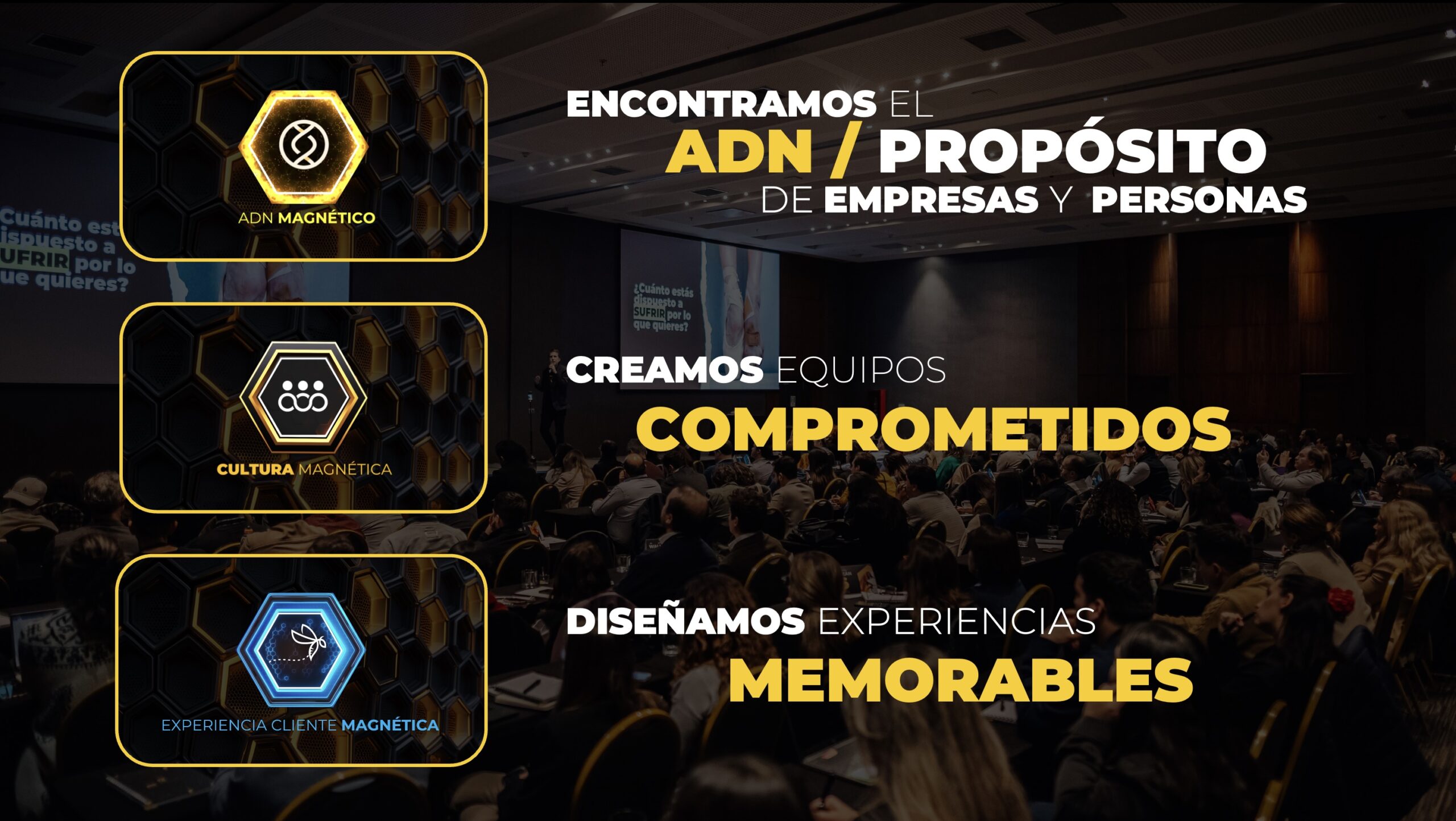 Creemos profundamente que las empresas y su impacto se activa desde adentro. Por eso desarrollamos el modelo de "La Cadena Magnética del Éxito" con 3 eslabones estratégicos: Propósito, Cultura Magnética de Pertenencia y Experiencias Memorables (inspirados en Disney)